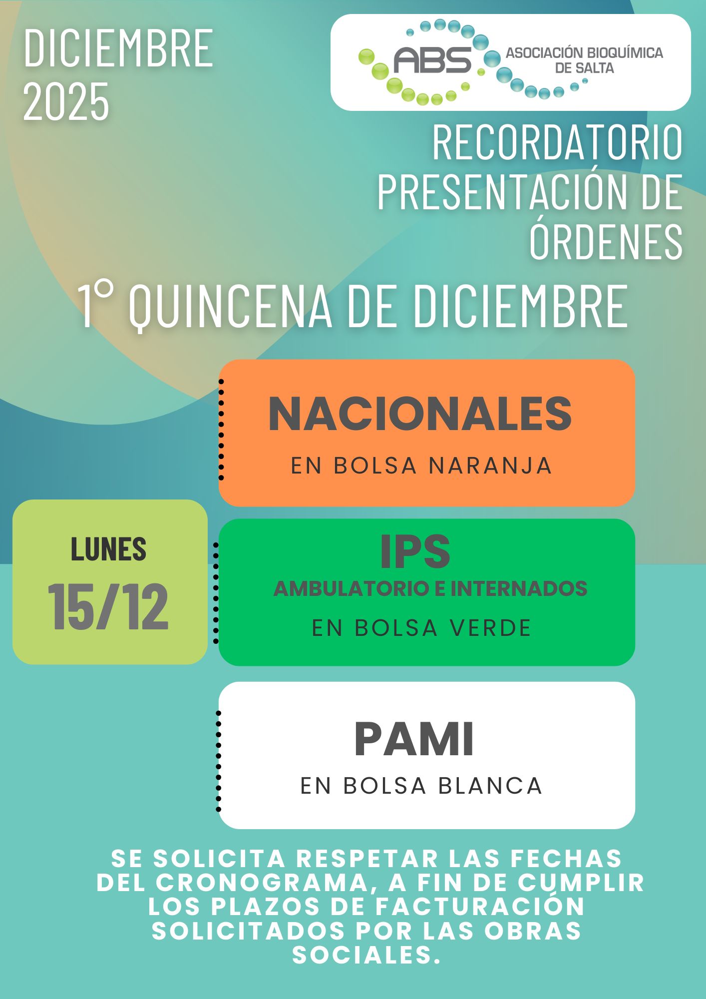 ⚠️ Atención Presentación de órdenes – Excepcional por Fiestas de Fin de Año 📌 Se solicita RESPETAR LAS FECHAS del cronograma, a fin de cumplir los plazos de facturación solicitados por las Obras Sociales . Atte. Comisión Directiva