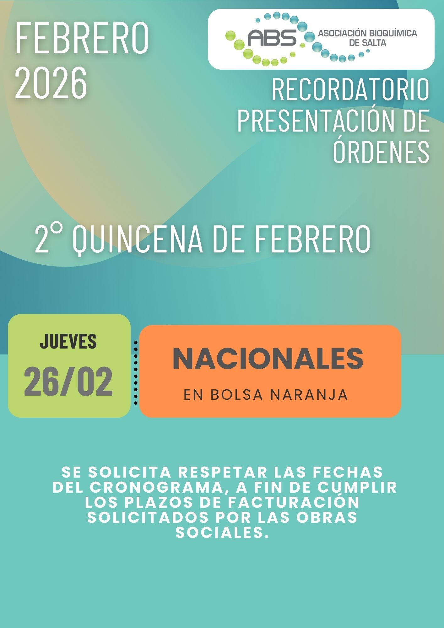 Recordamos a Uds. que según el cronograma de presentación de órdenes, el Jueves 26 de enero se presenta segunda quincena de obras sociales NACIONALES en bolsa naranja.