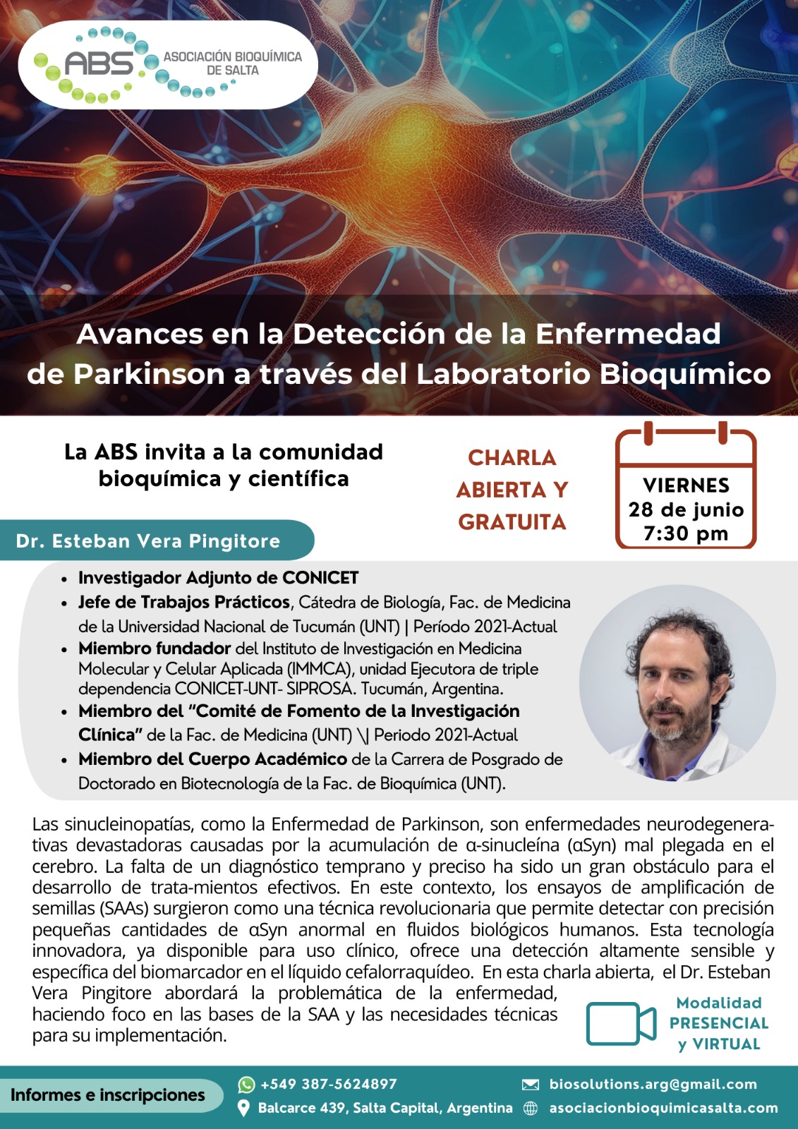 CHARLA ABIERTA Y GRATUITA: «Avances en la Detección de la Enfermedad de Parkinson a través del Laboratorio Bioquímico» – Dr. Esteban Vera Pingitore