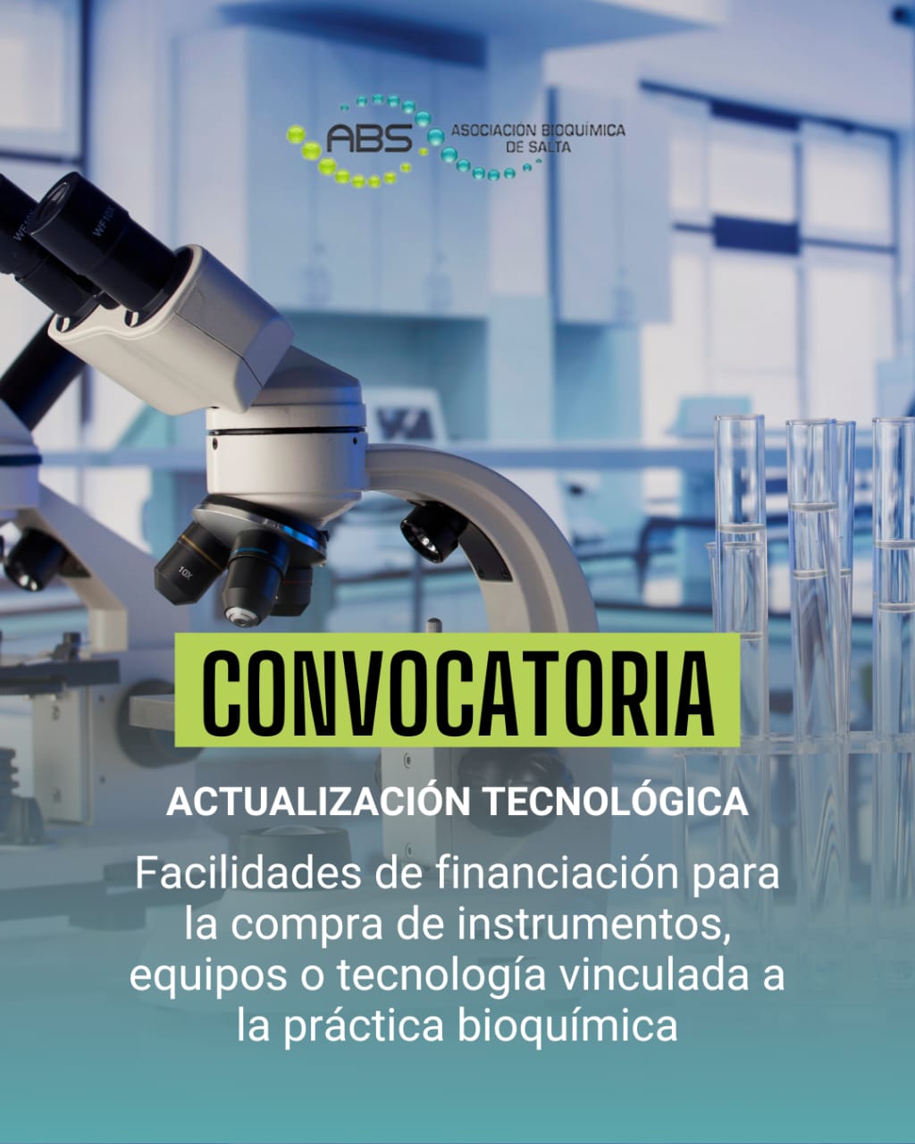 La Asociación Bioquímica de Salta invita a todos los bioquímicos interesados en adquirir equipamiento para sus laboratorios a participar de una convocatoria destinada a ofrecer facilidades de financiación para la compra de instrumentos, equipos o tecnología vinculada a la práctica bioquímica.