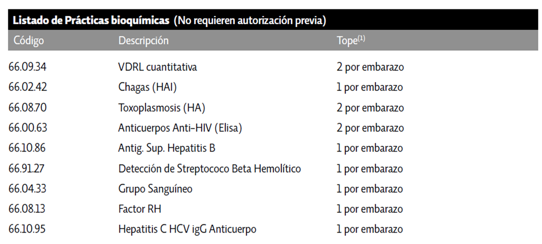La obra social informa que para su Programa Materno Infantil –Plan de Cobertura Madre– las siguientes prácticas bioquímicas No requieren autorización previa:
