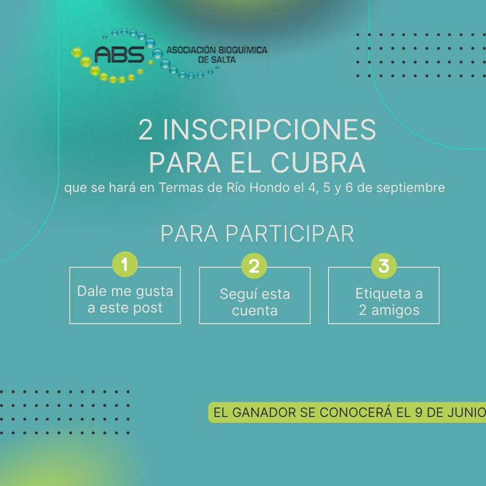 Participá por 2 inscripciones al Congreso de CUBRA 2025 ❗ En la cuenta oficial de Instagram de Asociación Bioquímica de Salta: https://www.instagram.com/asociacionbioquimicadesalta 1. Dale like al posteo 2. Seguinos 3. Etiquetá a dos amigos Los ganadores se conocerán el 9/06